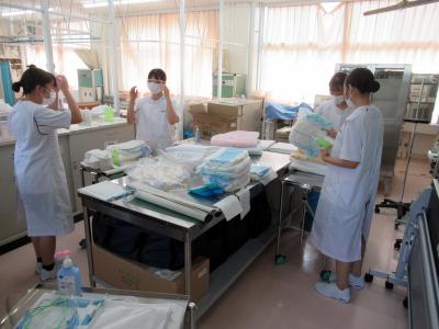9月28日衛生看護科21Hの生徒40名は、来月8日の戴帽式を前に実技試験に臨みました。戴帽式後には、初めての本格的な病院での実習があり、それに備えて実施しました。実技は①バイタルサイン測定、②シーツ・包布交換、③オムツ・寝衣交換の3つのテーマに分かれて受験しました。それぞれ、患者や環境に条件設定があり、その場で試験官から伝えられた実技について、自分たちでその場で考えて対応するという内容でした。患者役は生徒たちが交代で演じました。麻痺や腹痛などの症状のある患者や、ベッドのストッパーが外れていたり、シーツが汚れていたりなど、様々な状況設定について、自分たちの学んできた知識と技術を駆使して対応していました。