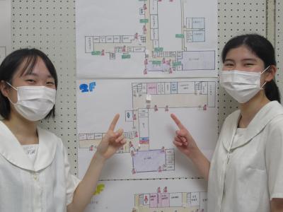 まずは、本校の災害時への備えがどのようになっているのか安全点検を行いました。消火器の設置場所や使い方を調べたり、火や薬品を扱う教室など火災が発生しやすい場所や、避難を妨げる環境などについて調べ、マップを作成しました。災害に備えて皆で共有しておくことがたくさん見えてきました。他にも救護や応急処置に利用できる物品や、搬送方法なども実演しながら学習しました。これらの成果は、鶴友祭や「はまラジ」を通して全校生徒で共有し、普段の学校全体の防災意識を高めるために働きかけていきます。学校で取り組んだことを生徒一人一人が家庭や地域で実践していくことで、「災害に強いまち」づくりに貢献していきます。