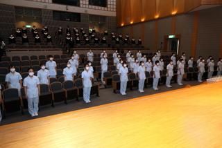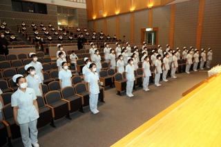全員の聖火が灯りステージ上に整列した後、ナイチンゲールの示した看護に携わる者の心構えである『ナイチンゲール誓詞』を、戴帽生全員が力強く斉唱し、看護師を目指す決意や実習に臨む自覚を新たにしました。