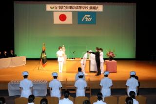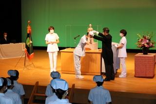 衛生看護科2年生の一人ひとりが担任から呼名され、ステージ上で、校長先生からナースキャップをいただきました。