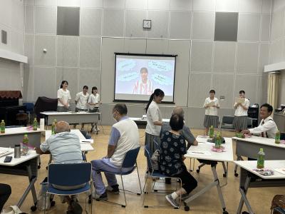 今まで学習してきたことをもとに、認知症とは何か、認知症の人の聞こえ方や、見えている世界を動画と寸劇を交えながら説明させていただきました。