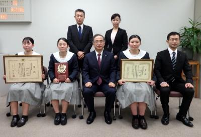 全国産業教育フェア全国高校生介護福祉研究発表会において最優秀賞・文部科学大臣賞を受賞しましたので、その報告のため県教育長を表敬しました。1月14日、石川県庁17階教育長室にて 石倉 星さん(32H) 岡本 彩莉さん(32H) 楠 れいささん(32H)の3名が訪問しました。