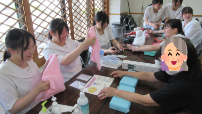 また、地域の方々への血圧測定やハンドケア、コミュニケーションを通して、いつまでも住み慣れたまちで、いきいきと暮らすための健康の秘訣をたくさん教えて頂きました。今日のお礼としてモールで作ったお花をプレゼントすると、「嬉しいわ。良い看護師になってね。」と、優しい言葉で勇気をいただき、和やかで心温まる交流会となりました。