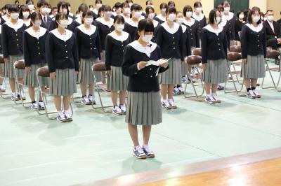新入生代表からは、「看護の心、福祉の心を持って、知識と技術の習得を目指すこと、学校の規則を守り、学業に励むことを誓います」と力強く新入生代表宣誓が行われ、滞りなく式は終了しました。