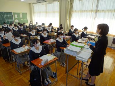 式の終了後には、衛生看護科・健康福祉科それぞれの教室に入って、担任の教員から、田鶴浜高校での学校生活をスタートするための話がありました。また、その間に、保護者・ご家族の方々に対して、保護者オリエンテーションで各係の教員から概要説明が行われました。