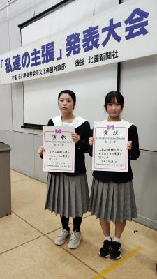 11月14日に行われた「私達の主張」発表大会に本校の11H中越心虹さん、加納那南さんが出場し、それぞれ優秀賞、優良賞を受賞しました。2名は9月に本校で開催された「校内私の主張大会」において高い評価を得てこの大会への切符を掴みました。当日まで内容の修正や練習を重ね、当日は緊張しながらも自分の想いを存分に伝えることができたようです。