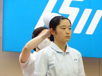 戴帽の儀では、校長より一人ひとりにナースキャップが授与されました。ナースキャップを受け取った生徒たちは、看護師への第一歩を踏み出す決意を胸に、凛とした表情を見せていました。