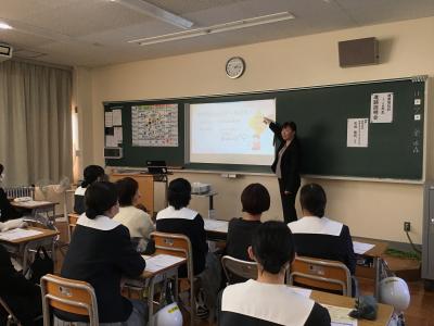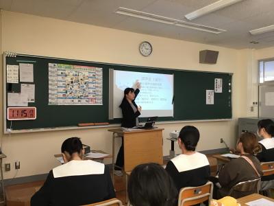 健康福祉科の進路説明会では健康福祉科主任兼第3年学年主任で進路指導課の古田佳代教諭が説明を実施し、また進路相談にも応じました。福祉就職、一般就職、進学と奨学金や、進路希望実現と国家試験合格の両立に関して、生徒は保護者とともに説明を聞いて確認し、自身の進路について改めて見つめ直し、今後の学びに繋げようと積極的な姿勢で臨んでいました。