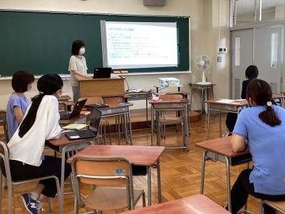 今回は、「衣食住」など生活に密着したテーマを8つ設定し、各グループが考えたプレゼン内容を若手教員間で共有し、意見交換会を行いました。生徒は、各テーマについて仮説を立て、それを検証するための実験をした結果について考察しており、本当によく考えながらプロジェクトに取り組んでいると驚かされるばかりでした。