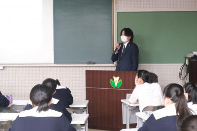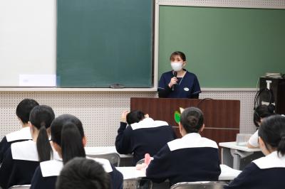 5月26日(金)の午後、本校卒業生を招き、進路講話を実施しました。これは地元を中心に活躍している卒業生の話を聞き、看護・福祉の専門職となる意識を高めるとともに、卒業生の職業人としての歩みを知り、自らの進路、生き方について考えることを目的として例年行っているものです。