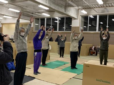 また、被災により病院への実習に参加できなかった生徒は、オンラインで災害看護の実践をしました。田鶴浜高校の避難所の被災者を対象にフェイズに応じた看護の実践を考え、避難所生活で起こりやすい疾病とその予防についてオンラインで健康教育を行いました。塩分過多やビタミン・食物繊維不足になりがちな食事の工夫、自律神経優位で緊張状態のストレスを解消するストレッチ、深部静脈血栓やフレイル予防のための運動等を実践し、被災者との一体感のある看護実践になりました。私たちとの交流を通して緊張し張りつめていた心身を、ひと時でもリラックスできるようにと願っての実践でした。体操やクイズでは、皆さんの笑顔が見られ、生徒も笑顔になる良い時間となりました。
