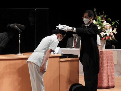 10月7日(金)、戴帽式が行われました。戴帽式は、衛生看護科2年生が来週から始まる本格的な臨地実習を前に、看護への志を新たにする大切な式です。長田校長より、一人一人にナースキャップが与えられました。