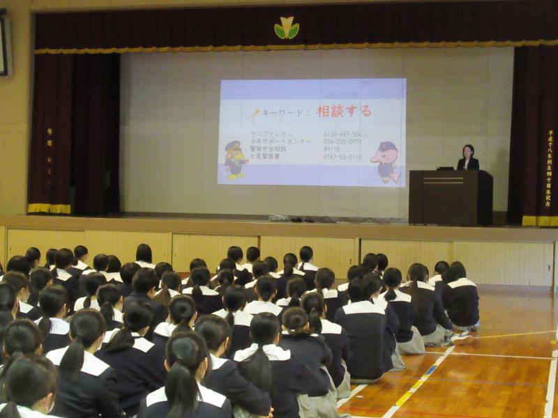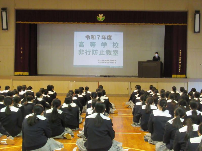 5月8日(木)、石川県教育委員会より上野氏、七尾警察署より小西氏を講師としてお招きし、全校生徒を対象に非行防止教室を開催しました。