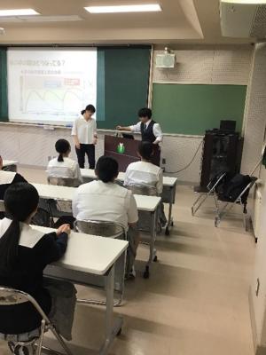 オーバードーズに関する動画を視聴した後、違法薬物や市販薬の乱用についてお話していただきました。一度行ってしまっては元に戻ることは難しいということを再確認しました。また、実際に薬とお茶の飲み合わせの実験を拝見するなど、用法容量を正しく守って服用することの大切さを知りました。