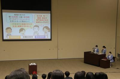1月18日に石川県地場産業振興センターで産学連携人材育成事業発表会が行われました。この発表会は、県内の職業に関する専門教育を行う県立学校の中で、研究指定を受けた各校が進めてきた取り組みの成果と課題について発表を行うものです。本校は「高校生が考える“多世代共生型のまちづくり”〜現状から課題を発見し、解決策を考え、試作する〜」と題して発表を行いました。