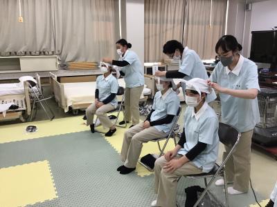 11月11日、12日、14日の3日間、日本赤十字社石川県支部より講師の方に来ていただき、救急法救急員養成講習を受講しました。心肺蘇生法などの一次救命処置や、傷病者の搬送、包帯法などについて、学科と実技の講習を受けました。福祉従事者として、また一般市民として必要な知識・技術であり、生徒たちは沢山のことを吸収しようと真剣に受講していました。また、放課後も傷の手当や骨折の手当など教わったことを身に付けようと熱心に実技練習に取り組む姿がありました。