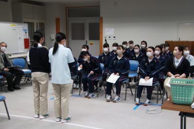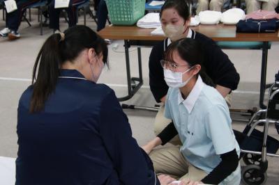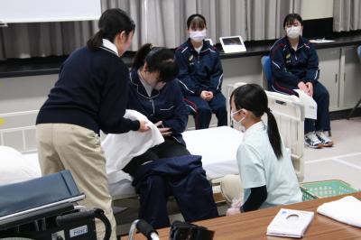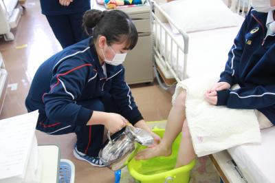 同日の午前中には、同じく石川県立看護大学の教室をお借りして足浴や臥位着脱、トイレ誘導に関する授業を行いました。被災に伴い本校の介護実習室が使えず、限られた環境の中で介護の練習をしていた生徒にとって、充実した環境で学習できたことが嬉しいようで、生徒も嬉しそうに実技の習得に励んでいました。また、足浴の授業では1年生と2年生が一緒に実技に臨みました。来年度から本格的な介護実習に臨む1年生に対して、2年生が施設の利用者様とのコミュニケーションの取り方のお手本を見せながら足浴の技術習得に励みました。
