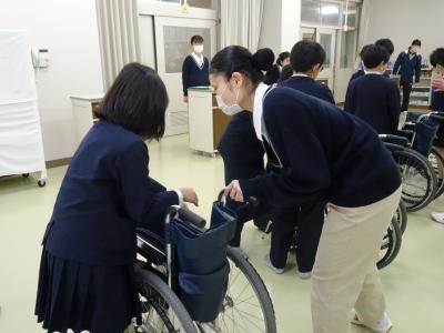 健康福祉科1・2年生が、中島小学校の4年生と「高齢者体験」と「車いす体験」の交流授業を行いました。普段、自分たちが学んでいる福祉の知識や技術をどのように伝えたら分かりやすいのか、興味をもって体験をしてもらえるのかを2年生が中心となり考え、実践しました。車いすでは、自動販売機の一番上の飲み物は買いづらいことや、白内障が進行した高齢者は、黄色いものがとても見えづらくなってしまうことなどを体験してもらいました。体験を終えた小学生から、「ずっと車いすで移動している人の大変さがわかった」「安全にできることが、相手にとっても自分にとってもいいとわかった」と感想を言ってもらい、とても温かな気持ちになりました。