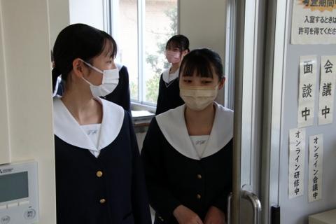 先輩から職員室の入退室の仕方や介護実習室等の使用方法についての説明を受けた新入生は「優しく教えてもらい嬉しかったです。」、「学校のことが少し分かりました。」と話してくれました。