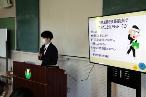 衛生看護科の生徒は助産師、養護教諭、看護師から、健康福祉科の生徒は介護福祉士、介護支援専門員、看護師から現場ならではの業務の内容や職種に対する熱い思い、そして高校生活の取り組みが進学・就職後にどのように役立ったかご講話をいただきました。