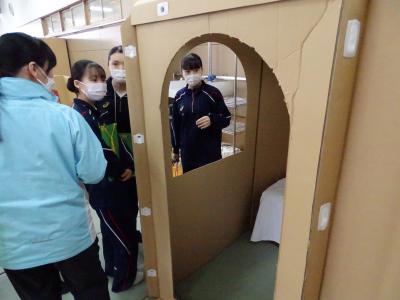 避難所見学・体験学習については避難所の運営統括を行う水野様からお話を伺うと共に、避難所内を見学することで、生徒は非常時における生活を継続するためにどのような工夫がされているのかを学ぶとともに、与えられた状況下で、可能な限りのQOLの向上を目指して考え続けることの大切さを感じたようでした。