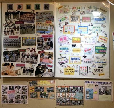 衛生看護科と健康福祉科の活動や生徒の活躍の様子をパネル等で紹介しています。