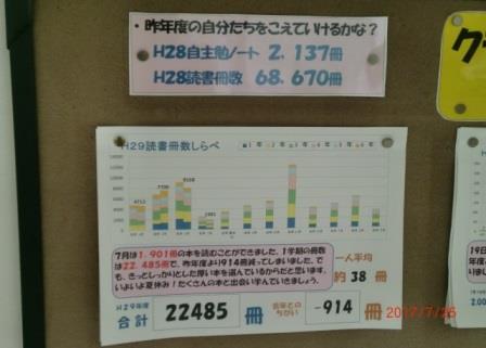 校長室前と職員室前に、読書に関する掲示板を作って、活用している。子ども達は、よく目にする場所にあるので、毎月の冊数の変化や新刊図書の紹介などをよく見ている。