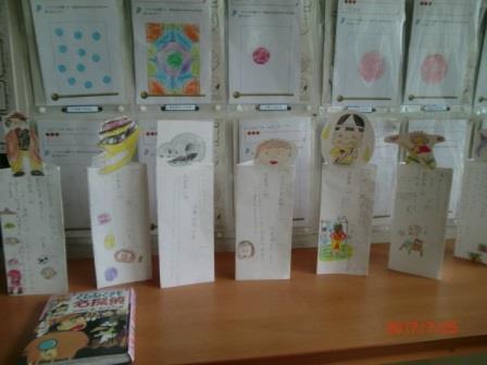 図書室前に、国語科の言語活動などで作成したものを展示した。