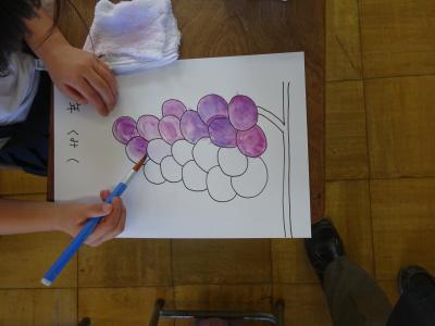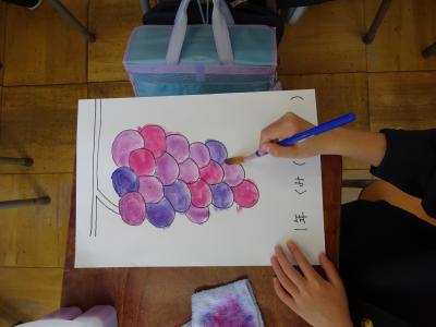 【図工】絵具を混ぜて水加減を調節しながら、ブドウの房の色をつくってぬりました。一人一人の個性が光るブドウが出来上がりました。