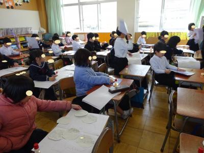 図工の学習で、オリジナルの紙けん玉を作りました。「どうしたらもっと遊びたくなるかな?」「どうしたらもっとおもしろいけん玉になるかな?」とよく考えながら形やデザインを考え、一人ひとりが自分だけの紙けん玉を制作しました。完成後は、友だちと作品を交換し合い、楽しく遊ぶことができました。