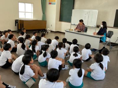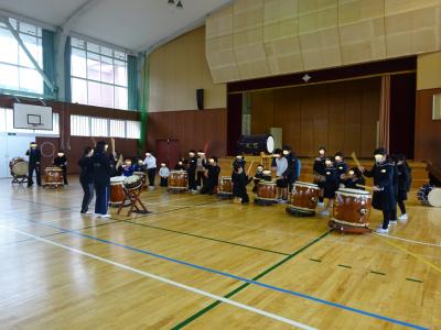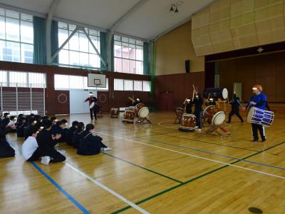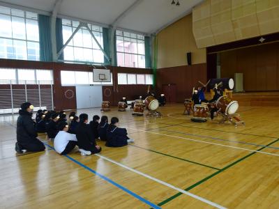 3年生が音楽の学習で、「九谷太鼓」の皆さんを講師にお招きし、太鼓の鑑賞と体験をしました。3,3,7拍子に合わせて太鼓をたたいたり、力強い九谷太鼓の皆さんの演奏を聴いたりしました。子ども達は感想で、「みんなで音を合わせるのが楽しかったです。」「九谷太鼓さんの太鼓がとてもかっこよかったです。」などの感想を伝えていました。