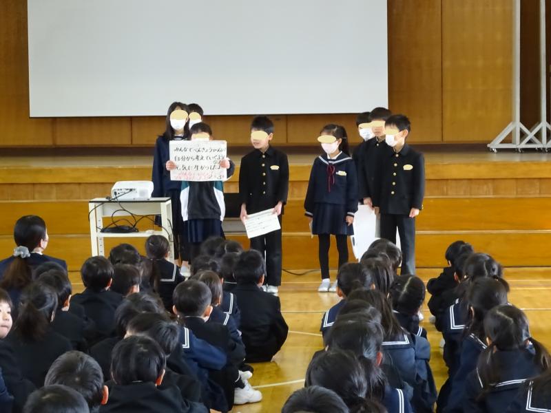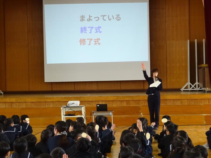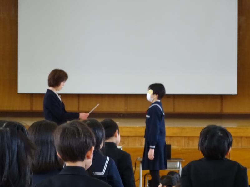 硬筆書写コンクールに入賞した児童の表彰の後、生徒指導の先生からは、春休みにお世話になってはいけない「音」のクイズを出しながら、春休みの生活についてのお話がありました。