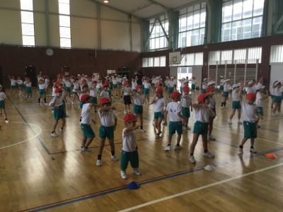 1年生と2年生が運動会でのダンスの練習をがんばっています!まだ動きを覚えている途中ですが、子どもたちは音楽に合わせて一生懸命、体を動かしています。
