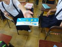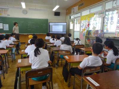 始業式の後、各クラスでは、夏休みに子ども達が取り組んだ作品や研究を発表したり、グループで見合ったりしました。友達の作品紹介に「へー、すごい!」「かわいい!」「作るの大変やった?」など感想を伝えあい、久しぶりの友達との交流をたのしんでいました。