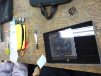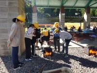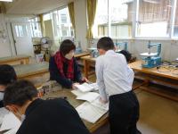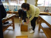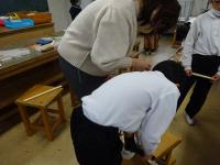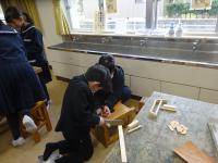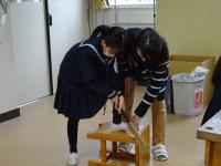 3年生が図工でのこぎりを使って学習しています。子ども達の安全を見守るために、地域学習サポータの方々に来て頂いています。