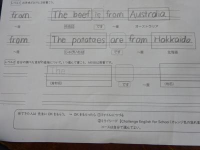 数を数えられるものと、数えられないもので、「~です」に当たる動詞が変わることを学び、自分が選んだ食材の産地を伝える文章を書きあげていました。読む、書く、伝える力が確実に身についていて、頼もしい6年生です。