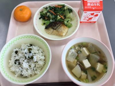 献立は、「わかめごはん、さばのゆずみそ焼き、ほうれん草のごま和え、