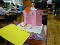 2年生が図工の学習で、カッターナイフを使って「まどのあるたてもの」をつくっていました。カッターを安全に正しく使い、自分の好きな形の窓をたくさん開け、窓からくまさんやフルーツなど、自分の好きなものが見えるようにしていました。高く積み上げたり、画用紙の庭に、池やバトミントンコートを描いたり、建物と建物をトンネルでつないだりと、子ども達は、想像を膨らませ、自分の表したい世界をいきいきと創造していました。
