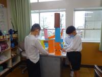 しっかり足で押さえることやのこぎりの引き方などを個別に見て頂いて、細かな部品をのこぎりで切ることができています。子ども達も気軽に地域学習サポーターの方に声をかけ、助けてもらい作業がはかどっていました。設計通りにうまく切り落とせると「できた!」満足気な表情。