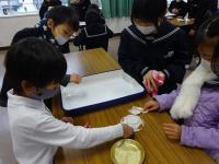 4年生が総合的な学習の時間に、九谷焼について学んでいます。地域の工房の方を招いて、転写シールでお皿に模様をつける方法を教えてもらいました。