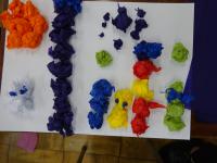 1年生が図工の学習に取り組んでいました。お花紙をちぎったり丸めたりくしゃくしゃしたりして、作品作りに取り組みました。友達のを見て参考にする子、集中して取り組む子、じっくり考えて取り組む子、その子らしく楽しんでいました。