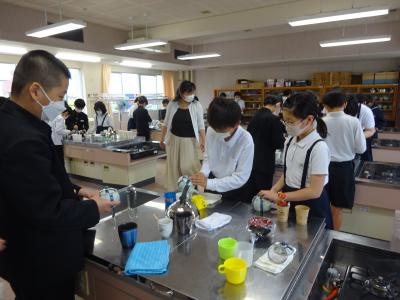 5年生が、家庭科でお茶を入れる学習をしました。今年度から、能美市のガイドラインが変更となり、気を付けて調理実習を行います。