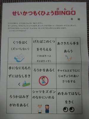 1学期の生活目標は、「きまりを守って生活しよう」です。この目標を達成するために、児童会で考えた企画「せいかつもくひょうBINGO」が、今日から始まりました。