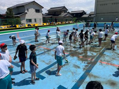 6年生が力を合わせて、学校のプールをきれいに掃除しました。こびりついた汚れや落ち葉も、協力してすっかりピカピカに!いよいよプール学習も始まり、水泳の目標に向かって元気に取り組んでいます。