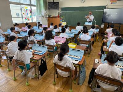 1年生が音楽の授業で、初めて鍵盤ハーモニカを使いました。今回は、特別に講師の先生に来ていただきました。楽器の名前や持ち方、吹き口の使い方、そして音の出し方など、ひとつひとつ丁寧に教えていただきました。音が出ると嬉しそうな笑顔を見せていました。友達と一緒に音を出してみたり、先生のまねをしてみたりしながら、楽しんで学習に取り組んでいました。これから音楽の時間に、少しずつ曲を演奏できるようになるのが楽しみです。