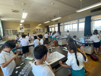 図工の学習で「ならべて 見つけて いろいろ色水」という活動を行いました。色水を透明な容器に入れ、色を混ぜたり、光にすかして見たり、複数の色を並べたりする中で、子どもたちは色の美しさや不思議さをじっくりと感じ取っていました。いきいきと、楽しそうに学ぶ姿がたくさん見られました。