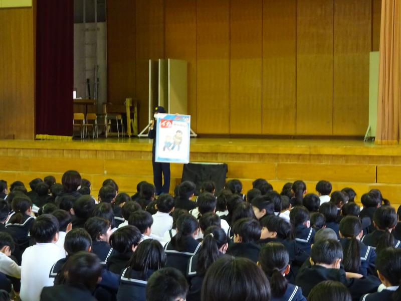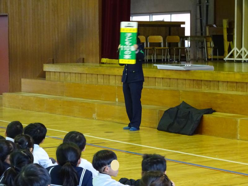 能美警察署の方にも訓練の様子を見ていただきました。不審者確保の後、体育館に避難し、警察の方のお話を聞きました。警察の方からは、「静かに行動できていた」「いかのおすしをまもって自分の命を守ってほしい」とのお話がありました。