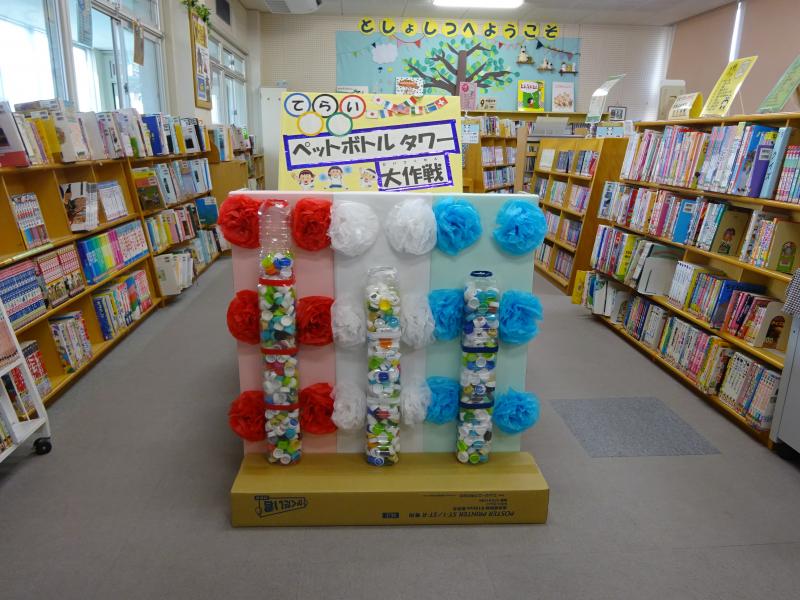 図書室で、寺井オリンピックにちなんで、赤団、白団、青団対抗の「ペットボトルタワー 大作戦」が繰り広げられています。図書室に本を借りに来たら、ペットボトルキャップが1つもらえます。今のところ、赤団がやや優勢か??