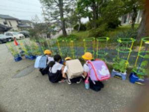 生活科の学習で、自分で選んだ野菜の苗を植えました。地域のボランティアの方々や、北陸先端科学技術大学院大学の留学生の皆さんに苗の植え方を教えていただきながら、丁寧に植えることができました。それからは、毎朝水やりをしたり、わき芽を摘んだりしながら、野菜が元気に育つように大切にお世話をしています。子どもたちは「昨日より葉っぱが大きくなった!」「小さい実がなった!」など、苗の変化にも気づき、野菜の成長を喜んでいます。子どもたちにとって、大切な学びの機会となるよう、これからも見守っていきます。