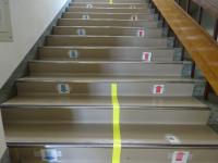 その中から、早速形になったのが、「階段の右側通行」です。廊下の密を防ぐためにと、児童が考えたアイデアです。みんなが右側通行できるようにと、児童会メンバーが休み時間などを使って階段等にテープや印を貼ってくれました。